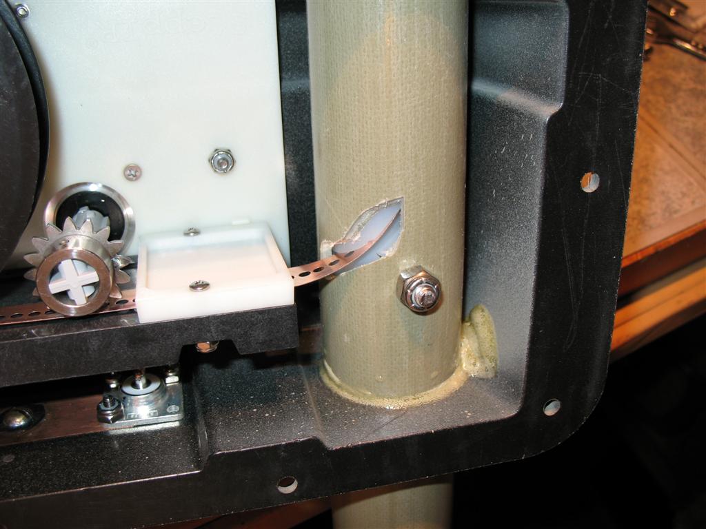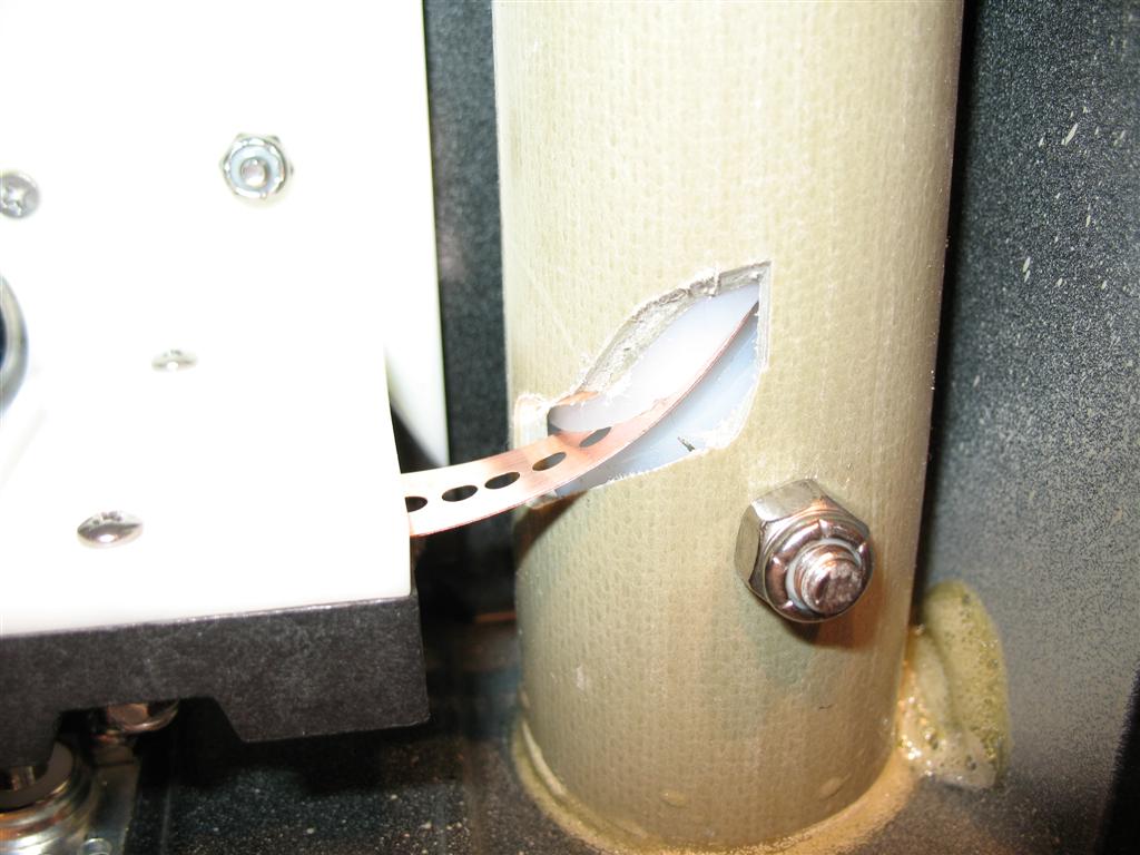 The copper-beryllium tape enters the fiber-glass pole section thru this opening. There is a nylon tape guide inserted in the fiber-glass pole section.